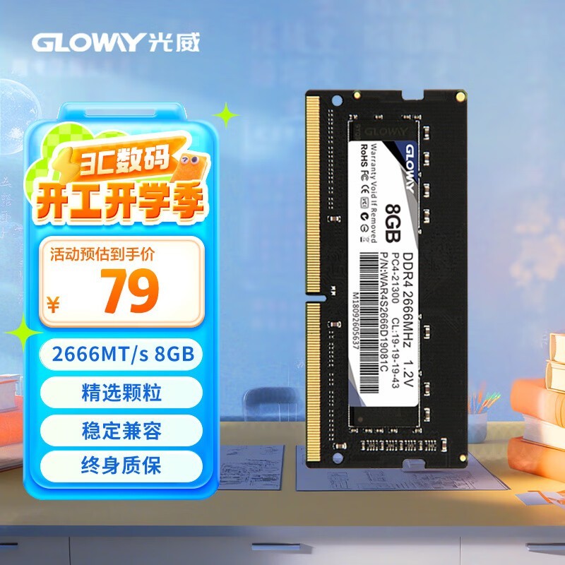 光威 8GB DDR4 2666笔记本内存,单条8GB容量,黑色经典设计,频率稳定运行在2666MHz,时序为19-19-19-43,能够为您的设备提供高速流畅的运行体验和低延迟响应。该内存选用优质颗粒,可靠性强,是游戏本扩容的理想选择。目前京东活动光威 8GB DDR4 2666售价仅79元,相比原价85元更加优惠,如果您想提升笔记本性能和运行速度,光威 8GB DDR4 2666内存是不错的选择,但请确保符合您的笔记本扩展条件和使用需求。