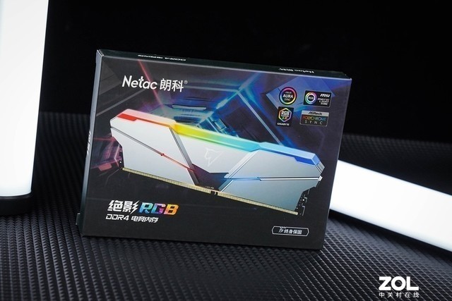朗科 16GB DDR4 3600电镀版的内存包装在纸箱里,Netac朗科的标志在左上角,中间部分是一个很酷的内存本体和LED灯条的效果图是产品的型号,彩虹色RGB字特别亮,右上角支持与多个品牌主板的灯光效果联动。