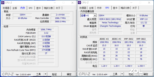 通过读取SPD信息,可以看出这套内存的起始速率为2133MT/s,电压为1.2V。内置两档XMP数据,第一档XMP DDR4-3600采用18-22-22-42的时序和1.35V电压,第二档XMP DDR4-3600时序为16-18-18-38的超低时序,第二档XMP DDR4-3600时序为1.35V。