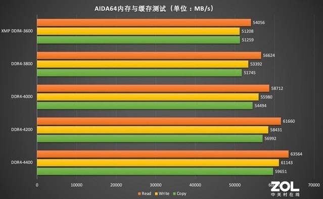 先看AIDA64内存和缓存测试,朗科 16GB DDR4 3600电镀版内存在XMP DDR4-3600模式读取速度为54056MB/s,写入速度为51208MB/s;超频到最高DDR4-4400模式,读取速度达到6344MB/s,写入速度达到6143MB/s。