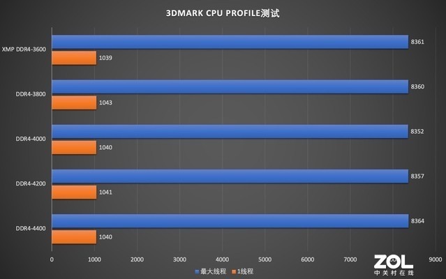 DDR4-3600模式的最大线程得分为8361,1线程得分为1039;DDR-4000模式得分最低,最大线程得分为8352,1线程得分为1040;超频到最高DDR-4400,最大线程得分为8364,1线程得分为1040。