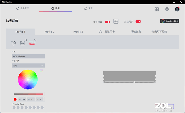 目前,机箱的侧透和全透风格已经成为主流,配备RGB灯光效果的各种配件无疑会让机箱内部的氛围变得绚丽活泼。朗科 16GB DDR4 3600电镀版内存顶部配备RGB灯条,支持华硕、技嘉、微星、华清四大品牌主板实现RGB灯光效果联动。因此,内存的灯光效果可以在主板的灯光控制APP中进行调整。比如我们测试平台的微星主板MSICenter有彩虹、流光、呼吸等多种效果,可以和游戏联动。