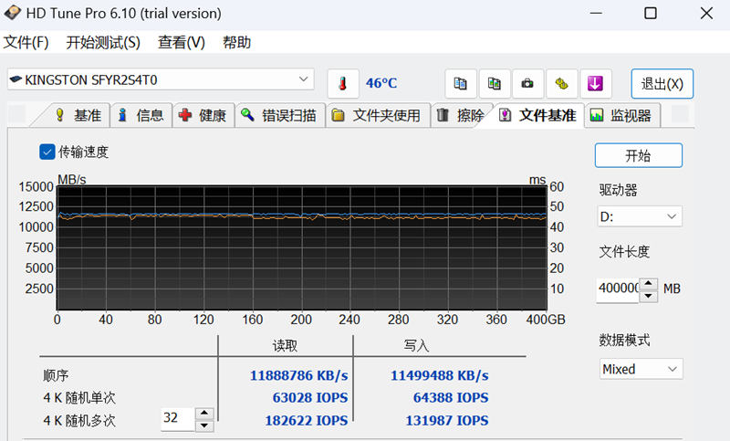为了提升消费级固态硬盘的性能,业界普遍采用SLC缓存的方式,即在固态硬盘的空余空间划分一部分作为数据高速“缓冲池”,来实现满速写入的效果。在HD Tune Pro中,向Kingston FURY Renegade G5 4TB写入400GB的数据,通过图形可以看到读写曲线均在1.18GB/s以上,没有出现掉速情况,可见SLC缓存容量远超400GB。