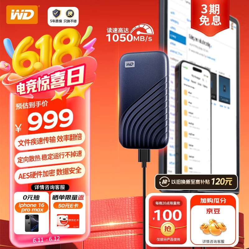 西部数据 My Passport SSD 2TB Type-C 1050MB/s 固态移动硬盘,现京东自营活动售价999元,叠加满减后仅需999元到手,为近期好价。西部数据 My PassportSSD外形紧凑纤薄,尺寸仅为10 x 5.5 x 0.9cm,重约45克,小巧轻便易于携带。全金属机身设计,圆润流线型外观,耐用性强,可抗1.98米垂直跌落冲击。西部数据 My Passport内置高性能SSD固态硬盘,支持USB 3.2 Gen 2高速传输,读取速度最高达1050MB/s,写入速度高达1000MB/s,大幅提升文件传输效率。支持256位AES加密,保障数据安全,兼容Win和Mac系统,即插即用。