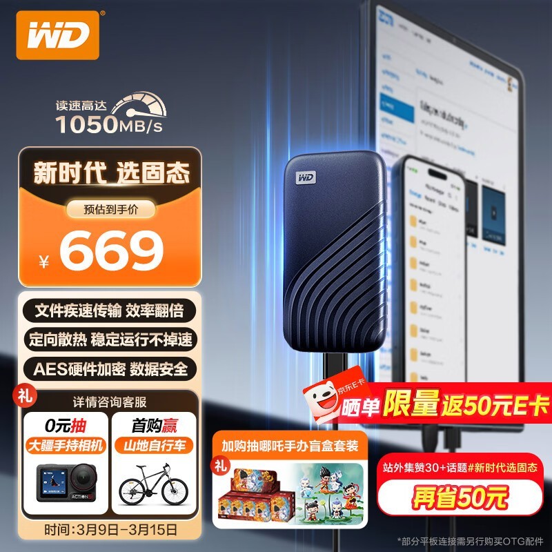 西部数据 My Passport随行SSD系列移动固态硬盘,采用NVMe高速技术和USB-C接口,读取速度高达1050MB/s,写入速度高达1000MB/s,同时具备防冲击外形设计、密码保护以及256位AES硬件加密功能,广泛兼容PC及苹果电脑,随插随用,无需额外设置,轻松存储和传输重要数据。西部数据 My Passport 1TB宇宙蓝版本不仅外观精美,还提供了充足存储空间,非常适合商务人士和专业用户。