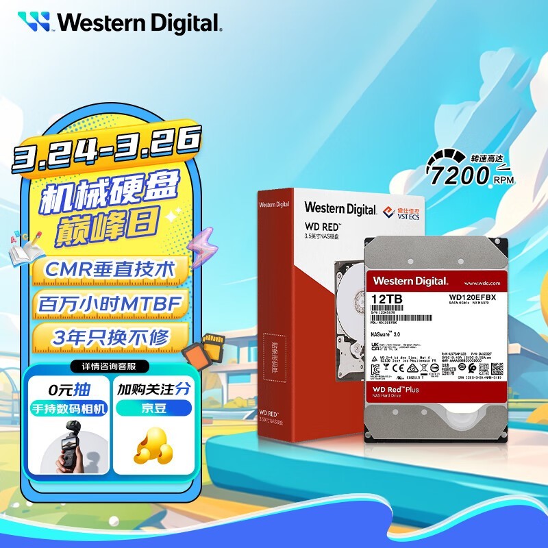 西部数据 红盘Plus NAS机械硬盘 WD Red Plus 12TB 7200转 256MB SATA CMR 网络存储 3.5英寸 WD120EFBX
