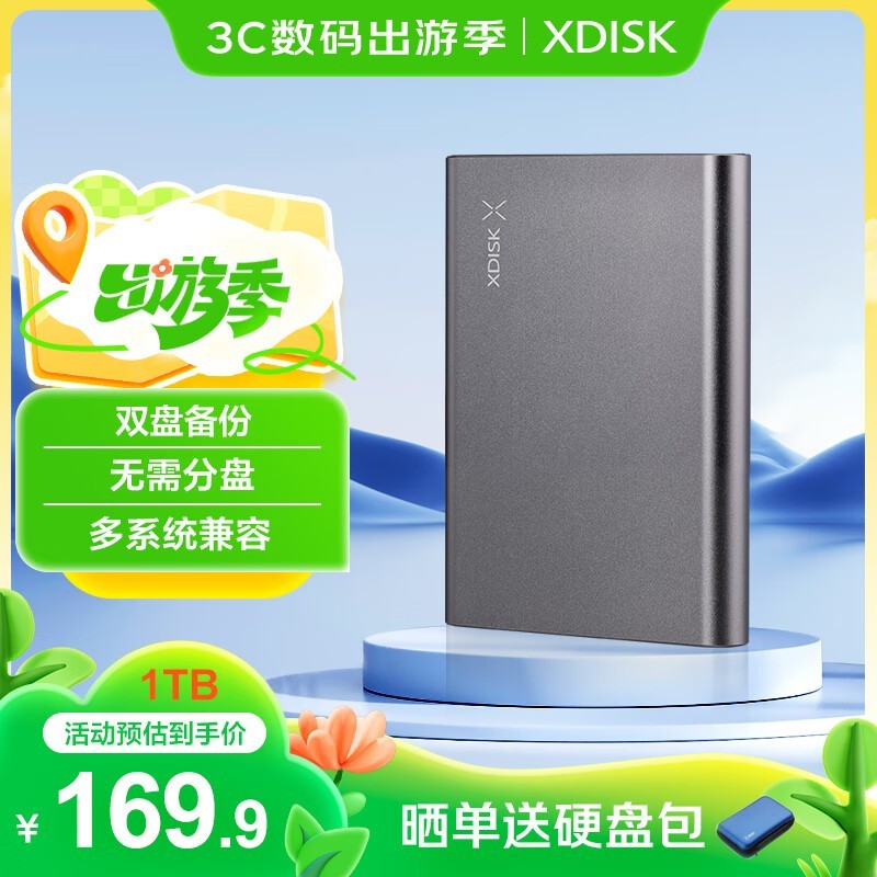 小盘 XDISK 移动硬盘 1TB 正在京东自营开展限时优惠活动!原价179.90元,现在参与满179减10活动,到手价仅需169.90元,是近期难得的好价。小盘 XDISK移动硬盘采用2.5英寸设计,尺寸约1118718MM,重量仅约248g,轻便易携。小盘 XDISK外观为太空灰磨砂合金外壳,不仅散热更快,还提升了耐用性。小盘 XDISK内置原厂主控和精心挑选的A级芯片,搭配USB3.0高速接口,传输速度更快,兼容Windows/MAC系统,支持电脑、手机、笔记本和平板等多种主流设备。同时具备双盘备份功能,让数据存储更安全可靠。抓紧机会入手吧!