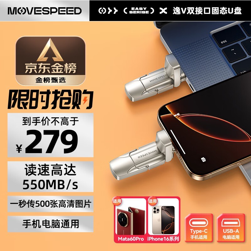 移速 逸V 512GB固态u盘 USB3.1 Type-C 双接口手机电脑两用移动U盘 稳定不掉速 支持苹果15-16 系列