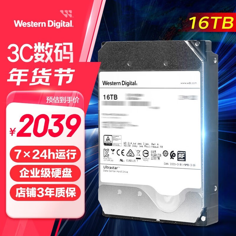 海康威视 西数企业级硬盘16TB 512MB 7200RPM CMR垂直 SATA 服务器机械硬盘 网络存储服务器台式机