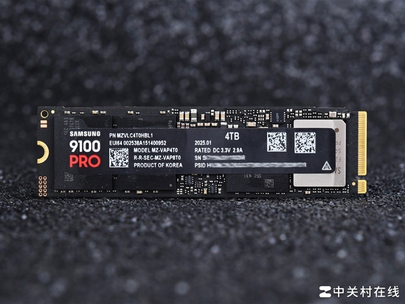 三星 9100 PRO标准版的外观延续了PRO系列的经典设计,给人以非常熟悉的感觉,只是正面的标签相对于上代产品990 PRO变窄了,能看到NAND FLASH、主控和DRAM缓存芯片。而散热片版则配备包裹式散热片,产品标签贴在了背面。