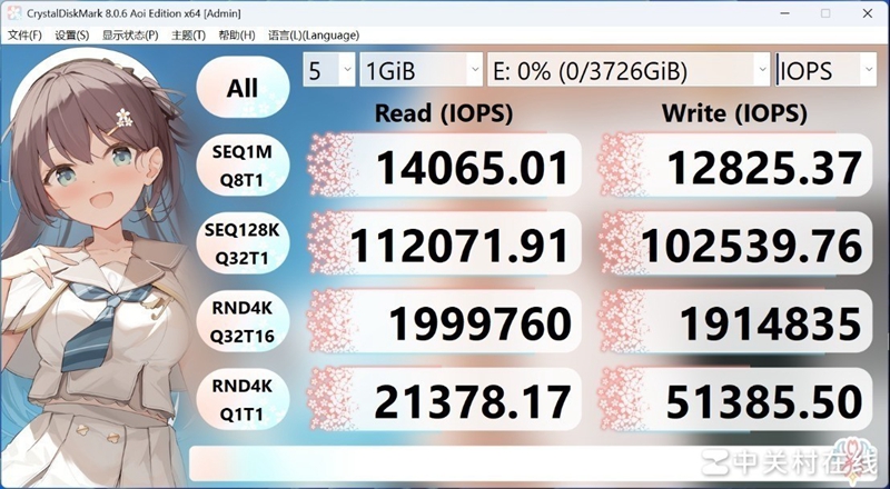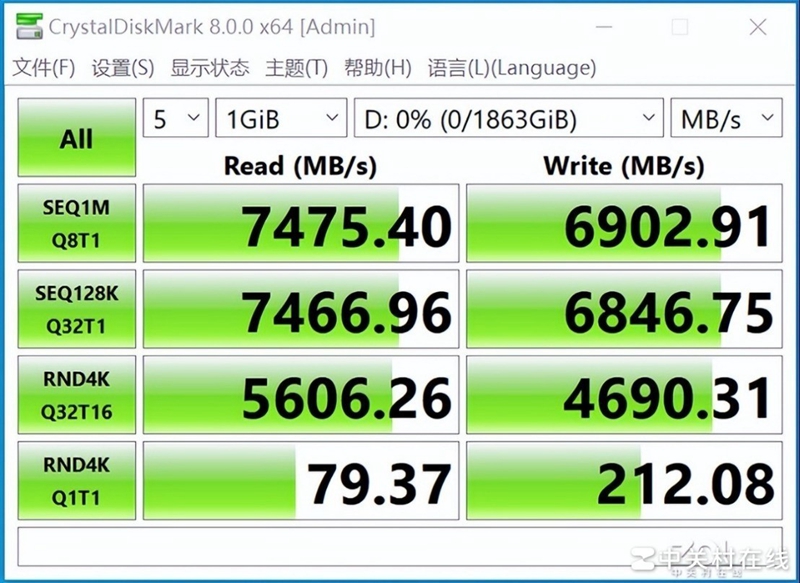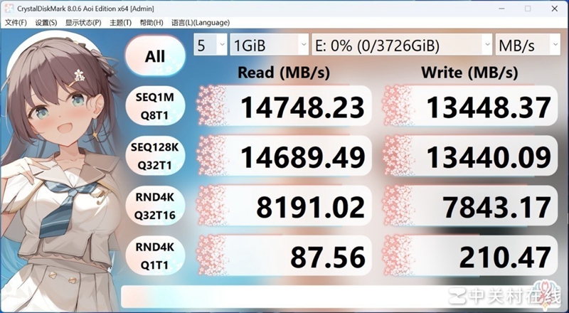 基准测试是表征一块固态硬盘标称数据的最直接方式。经Crystal Disk Mark实测,三星 9100 PRO 4TB连续读取速度高达14748.23MB/s和13448.37MB/s,与标称值相近,达到“满血”PCIe5.0水准。