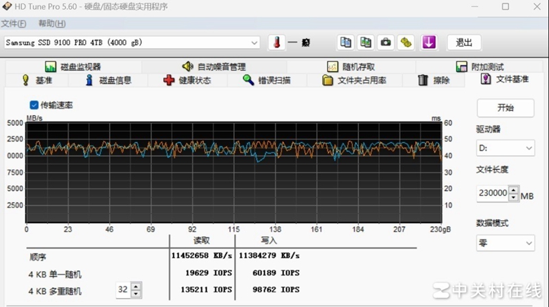 为了提升固态硬盘的连续写入性能,消费级产品普遍采用SLC缓存技术,三星专有TurboWrite技术,并已经进化到2.0版本,大幅提升SLC缓存空间。在HD Tune Pro的文件基准中设置230GB文件长度,从测试的图形可以看出三星 9100 PRO 4TB的SLC缓存大于设定的230GB。需要说明的是,HD Tune Pro是一款老资格的磁盘测试软件,UI左侧的速度标尺显然是被吃掉了个1,开发者显然是没想到日后的磁盘性能会突破五位数。
