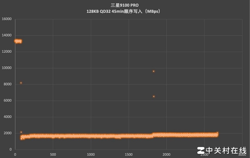 先执行顺序写入测试,设置128KB数据块和QD32队列,测试时间45分钟。从图形看,连续写入速度稳定在13100--13400MBps区间,77秒后缓存用尽,可知空盘时SLC缓存约为995GB左右,性能非常出众。