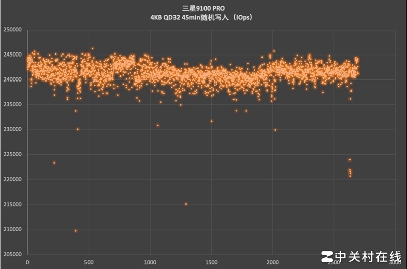 待主控Trim 40分钟后,再执行随机写入测试,设置4KB数据块和QD32队列,测试时间45分钟。从测试图形可以看出,三星 9100 PRO的实力非常强悍,密集区间处于240000~245000IOps,并且全程测试没有明显的波动,再次体现强大的稳定性。