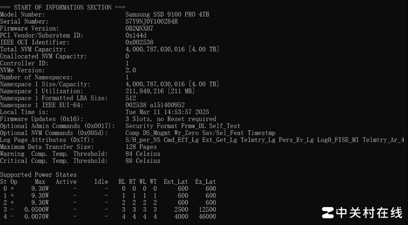 虽然是一款性能级产品,但三星 9100 PRO在能耗方面也非常注重,这主要是考虑到高性能游戏本用户的升级。在smartmontools中可以看到9100 PRO有5种预设模式,全速运行PS0--PS2模式最高功耗为9.3W,但浅度睡眠PS3模式可低至0.05W,深度睡眠PS4模式更是低至0.007W,整体甚至与一些DRAMLess的PCIe4.0固态硬盘旗鼓相当,可以提高电池的续航并降低散热压力。
