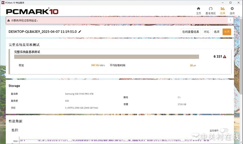 如果说基准测试过于数据化,那么应用模拟测试将会表征固态硬盘的综合性能。由于PCMARK10和3DMARK在不同的硬件平台跑分存在不小的差异,故这两项成绩仅供参考。先执行PCMARK10的完整系统盘测试,将固态硬盘模拟成系统盘,测试操作系统启动、办公和设计等场景下的表现,经测试,三星 9100 PRO 4TB整体得分6331分,带宽为997.95MB/s,平均存取时间为26μs。