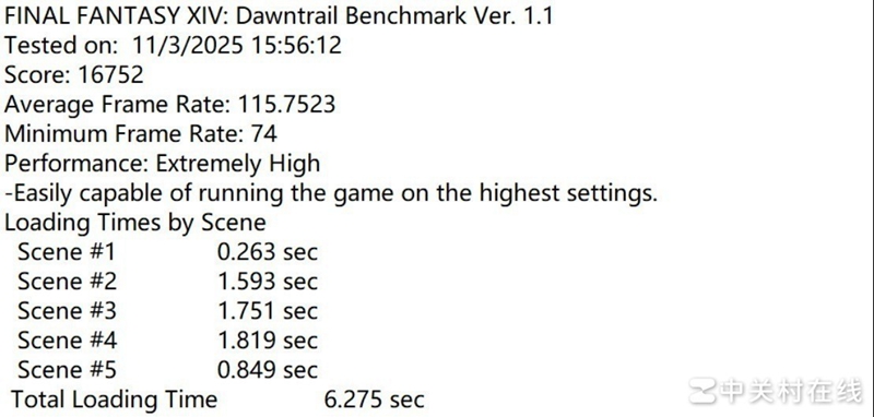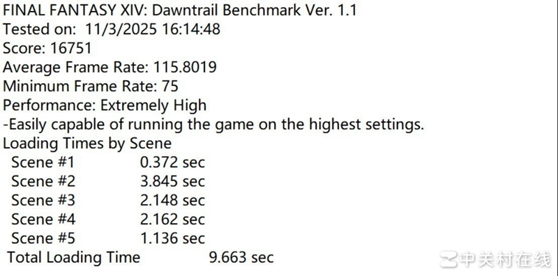 最后是《最终幻想:曦光旅路》(FINAL FANTASYXIV:Dawntrail)的Benchmark,这款DEMO可以记录所有测试场景的载入时间,直观体现游戏的加载情况。经测试,三星9100PRO4TB全部的转场载入时间仅为6.275秒,对比某PCIe4.0旗舰级固态硬盘的9.663秒,加载时间减少了35%,游戏加载速度优势非常巨大。