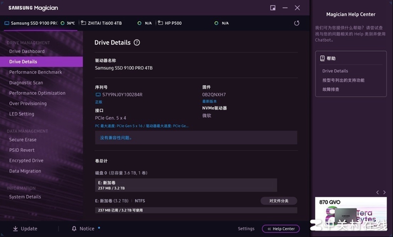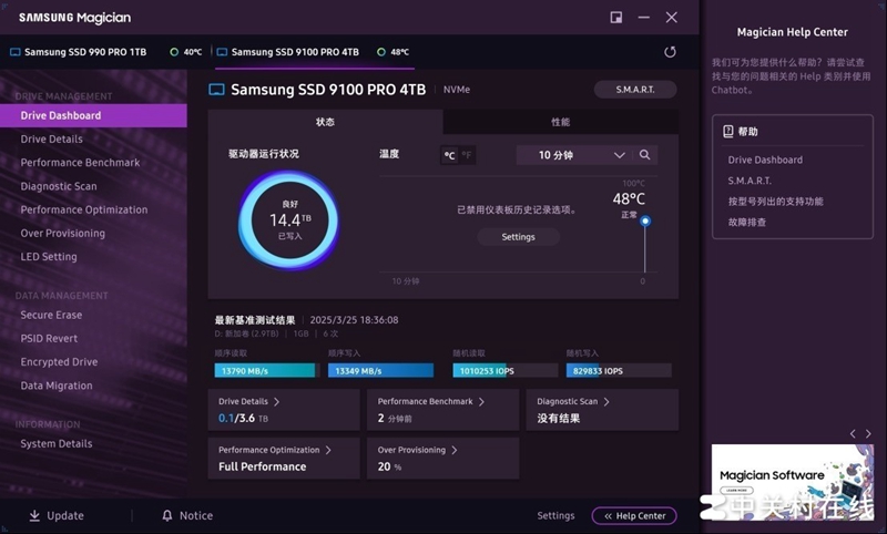 为了让用户随时了三星存储设备的健康状态,以及进行原厂级维护,三星存储推出了SAMSUNG Magician(三星魔术师),支持品牌旗下的固态硬盘、移动固态硬盘、U盘和存储卡等全线存储产品,包括9100 PRO。在Driver Dashboard中的“状态”选项卡,可显示三星 9100 PRO的已写入的总容量、当前磁盘的剩余空间、工作温度的变化和测速结果等。
