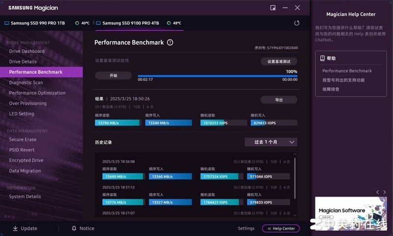 为了让用户轻松了解存储产品的性能,三星魔术师Performance Benchmark提供了测速功能,无需专业软件即可测试三星 9100 PRO的性能。