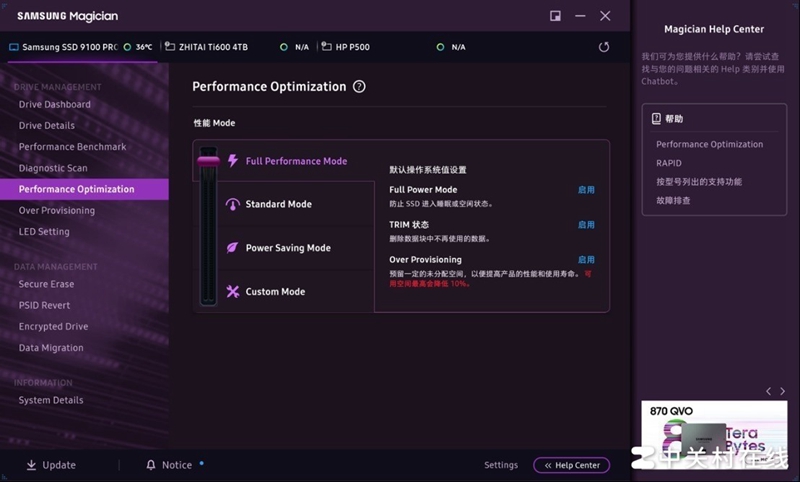 Performance Optimization为固态硬盘设置了四挡性能模式,包括Full Performance mode(全性能模式)、Standard Mode(标准模式)、Power Saving Mode(节能模式)和Custom Mode(自定义模式),用户可根据使用场景或者设备来自由选择。其中,Full Power Mode可关闭固态硬盘的睡眠和空闲状态,执行TRIM来提效,还预留一定的未分配空间来进一步提升性能和寿命。