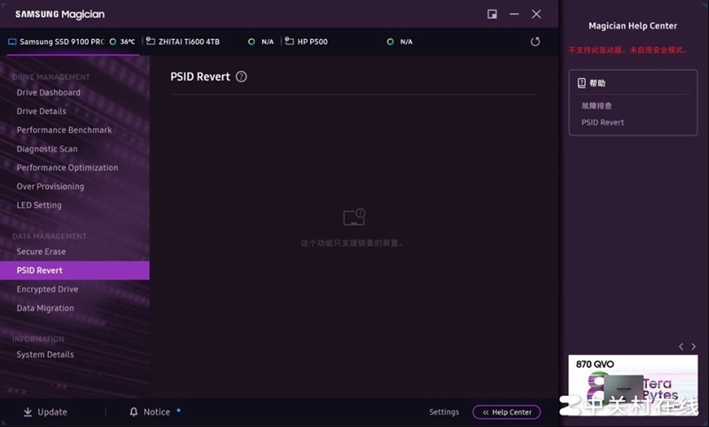 Driver Details可查看9100 PRO的详细信息,包括序列号、固件版本,并由此可以检测是否正版。值得一提的是,SAMSUNG Magician左下角有Update按钮,如果旁边有蓝色的圆点提示,即表示当前的设备有全新的固件可升级。