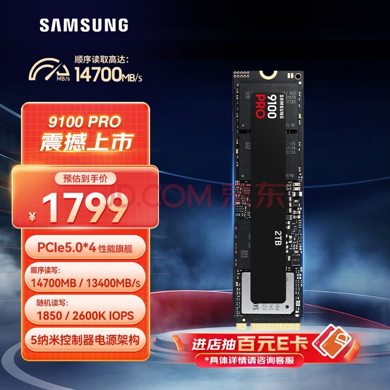 三星(SAMSUNG)2TB SSD固态硬盘 M.2接口(NVMe协议PCIe5.0*4)AI电脑配件 读速14700MB/S 9100 PRO