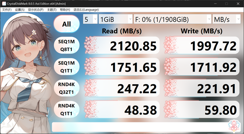 在CrystalDiskMark测试中,致态灵先锋版移动固态硬盘拿下了2120MB/s的连续读速,以及1997MB/s的连续写速,创下了速度新高,在存取大型文件时有极高的效率,2GB的文件1秒钟即可拷完。另外其4K读写速度也达到了220MB/s,即使是在移动固态上运行3A大作也毫无压力。