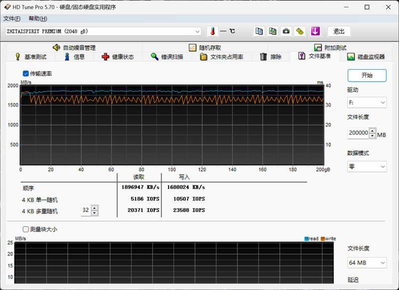 在HDTuenPro的测试中,我们向致态灵・先锋版移动固态硬盘写入200GB数据,可以看到写入速度一直保持在1700MB/s左右,读取速度一直稳定在1800MB/s以上,在200GB文件的读写过程中全程都没有掉速,在实际使用中丝毫不用担心会掉速。
