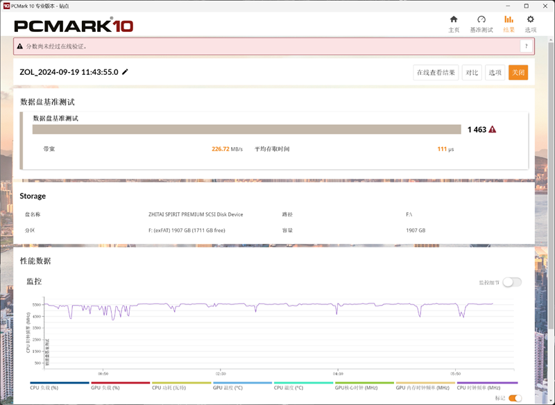 在PCMARK10数据盘基准测试中,致态灵・先锋版移动固态硬盘拿下1463分,平均带宽达到了226MB/s,平均存取时间为111μs,对于移动固态来说是非常棒的成绩了。