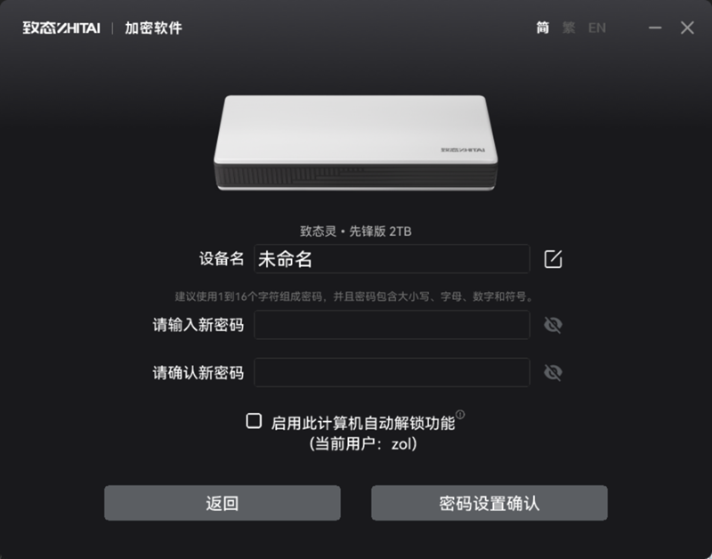 如果固态硬盘中有重要信息,就需要致态加密软件来发挥实力了,用户可以选择1-16个字符组成密码,保障数据的安全,即使被窃也不会造成数据泄露,而且贴心的是,软件还提供了当前计算机自动解锁的功能,但是密码一定要保管好。