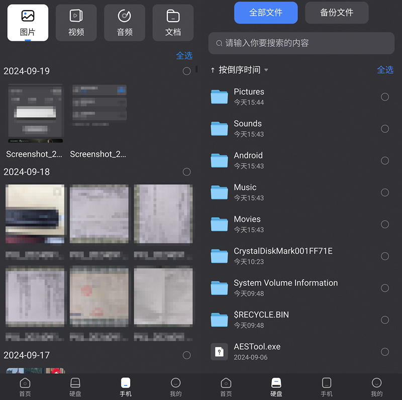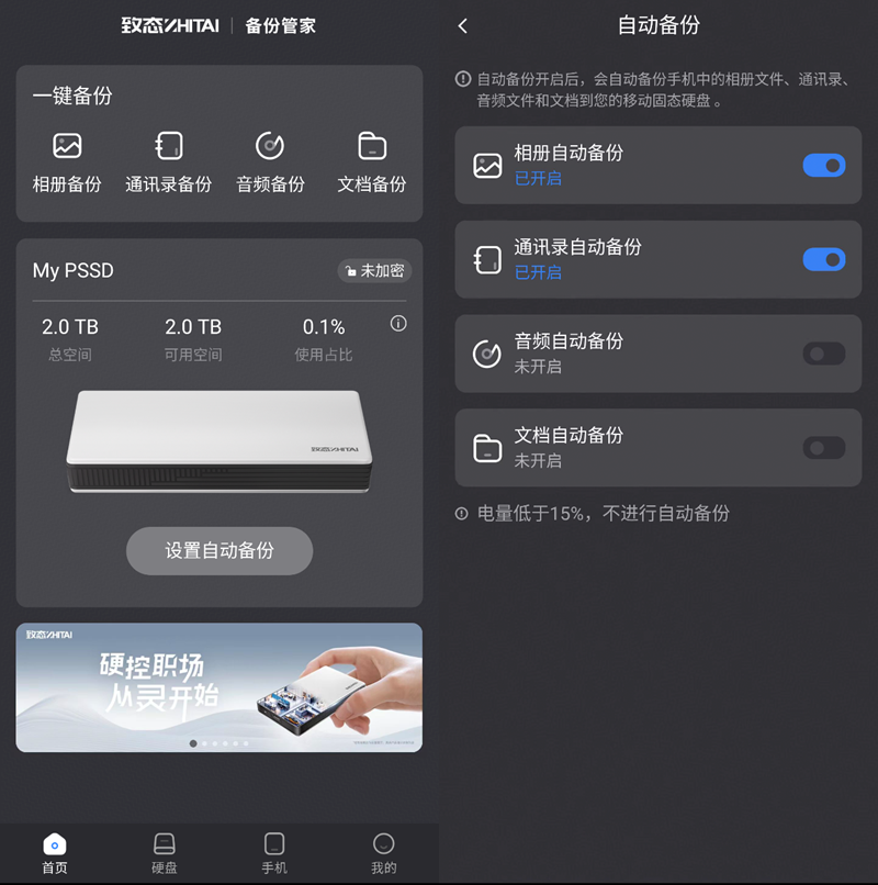 致态备份管家app则提供了连接移动设备的备份功能,用户可以选择相册,通讯录,音频以及文档的自动备份功能,也可以手动备份文件到移动固态中,对于喜欢摄影的用户来说非常友好,对于有换机需求的用户来说也极为实用。需要留意的是,该软件目前支持安卓和鸿蒙系统,暂不支持ios系统。