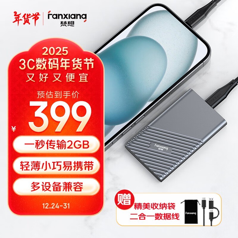 这款梵想 PS2000 USB3.2移动固态硬盘,目前在京东上的优惠价格为399元。原价469元,是一款性价比很高的产品。