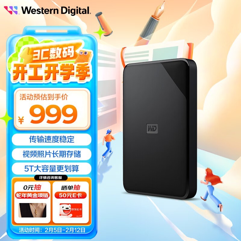 西部数据 SE 5TB 移动硬盘 USB3.0 2.5英寸 机械硬盘 大容量 手机笔记本电脑外接 外置办公 家庭存储