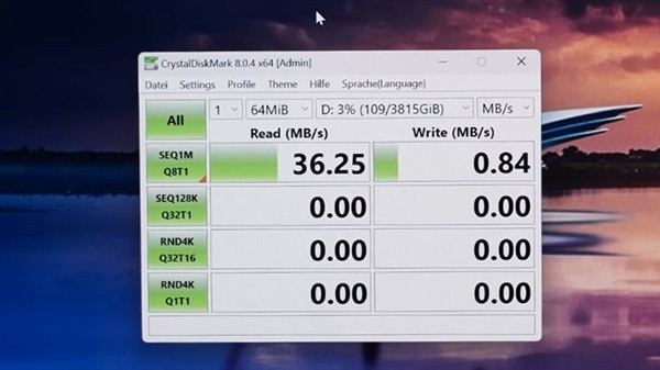 在连接电脑后进行测试,结果令人大跌眼镜。测速软件运行了整整24个小时,最终显示该SSD的顺序读取速度仅为36.25MB/s,写入速度更是仅有0.84MB/s。进一步调查发现,这实际上是一张64GB的microSD卡整合成的冒充4TB的SSD,可以说是一个巨大的骗局。