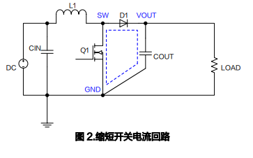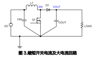 为减少系统回路上噪声和电磁辐射,不仅要减少开关电流回路长度,还要缩短大电流回路,并且大电流走线要采用敷铜处理,敷铜不要有锐角,尽量少打弯,尽量不换层,若走线必须得换层处理,需要适当增加过孔数量,这样可以减少过孔带来的寄生电感。可以将电感靠近芯片 SW,输入电容靠近电感和芯片的 GND,如“图 3”所示。