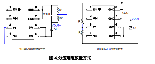系统回路中反馈走线也很重要,FB 引脚负责调整,稳定输出电压,为防止反馈引脚捡取到电路上噪声,应尽可能减小 FB 引脚节点。针对 FB 节点,需要让分压电阻靠近芯片的 FB 与 GND 引脚;并且反馈走线要远离电感,肖特基,SW 等开关节点,同时用 GND 走线包围最佳,如“图 4”所示。