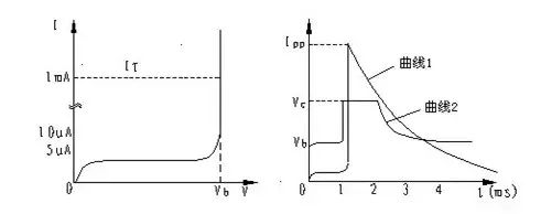 如果用图示仪观察TVS的特性,就可得到图1中左图所示的波形。如果单就这个曲线来看,TVS管和普通稳压管的击穿特性没有什么区别,为典型的PN结雪崩器件。