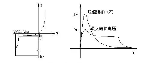 图中曲线1是TVS管中的电流波形,它表示流过TVS管的电流由1mA突然上升到峰值,然后按指数规律下降,造成这种电流冲击的原因可能是雷击、过压等。曲线2是TVS管两端电压的波形,它表示TVS中的电流突然上升时,TVS两端电压也随之上升,但最大只上升到VC值,这个值比击穿电压VBR略大,从而对后面的电路元件起到保护作用。