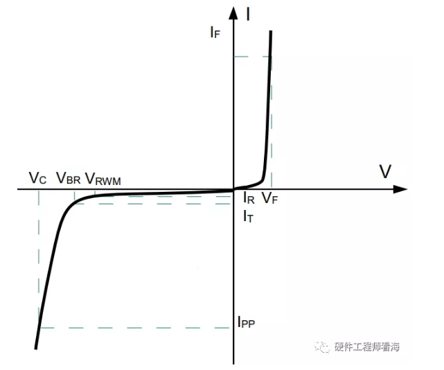 TVS的IV特性曲线见下图,第一象限是作为二极管时的输出特性曲线,有我们熟知的正向导通电压和导通电流两个参数。