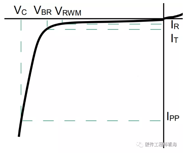 VC:Clamping Voltage @ IPP,箝位电压,在峰值电流IPP作用下,TVS两端的电压称为箝位电压,这是非常重要的参数,峰值电流IPP作用下,大部分能量是通过TVS流到地,电压被箝位,进而保护了TVS后面的电路。