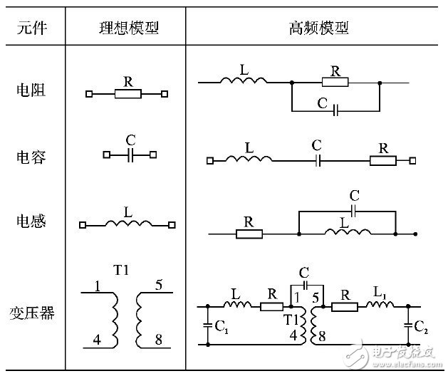 在各种无源器件中,电阻、电感和电容的高频等效寄生参数可以用高频阻抗分析仪测得。表1所示为各种无源器件的理想模型和高频等效模型。