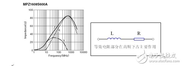 图1:反映磁珠电阻、感抗和总感抗的阻抗曲线及等效电路拓扑。