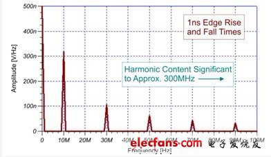 数字信号的频谱成分简化为其频率和升时间。时钟或者系统频率建立电路的时间基准,但其边缘率形成干扰谐波。图 1 显示了一个 10 MHz 方波的频谱成分。该 10 MHz 信号的边缘率为 10 ns。请注意,