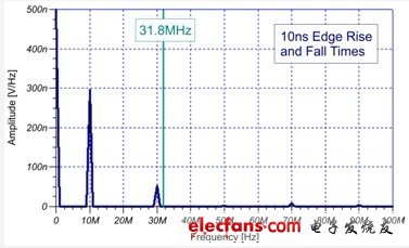 10 ns 边缘率时方程式结果为约 31.8 MHz。曲线图显示,最后一次明显谐波出现在30 MHz。同时,图 2 所示 1 ns 边缘率时方程式结果为 318 MHz 最大频率。如果您的电路易受 318 MHz 频带内产生的频率影响,则 EMI 谐波可能会使您的电路出现干扰。