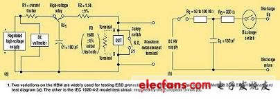 最流行的HBM变种是国际电工委员会IEC1000-4-2标准,定义为150pF电容通过一个330Ω电阻放电(图1b)。这是欧盟对在其区域内商品销售所必须的国际测试。