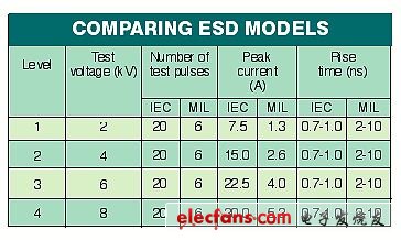 但是,明显的瞬间电压威胁和能量等级的不同存在于两个模型之中。于是设计工程师可以使测试过程适合他们所期望的具体应用。例如,IEC1000-4-2具有一个非常快速的电平脉冲上升时间,能应用更多的脉冲和更高的峰值电流(见表格)。