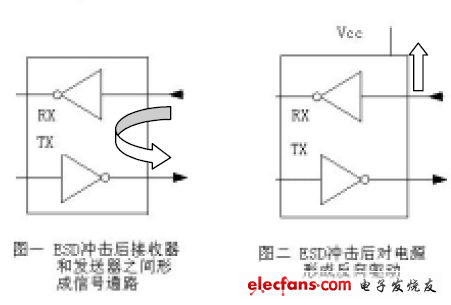 某些RS-232 接口电路中的ESD 保护结构经过ESD 冲击后可能在输入端与供电电源Vcc之间形成电流通路图二对其供电电源产生反向驱动如果供电电源没有吸入电流的能力通常来讲电源输出回路里有一个正向二极管这将导致电源电压Vcc 的增加从而损