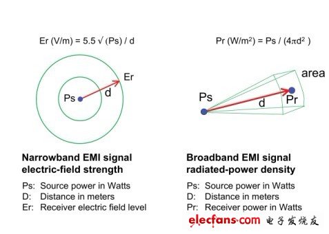呈辐射状的电磁干扰 (EMI) 信号会从辐射源传播至某个接收单元。根本而言,这些信号的功率或者电压强度在“触及”敏感的电路时,取决于发送器的功率/