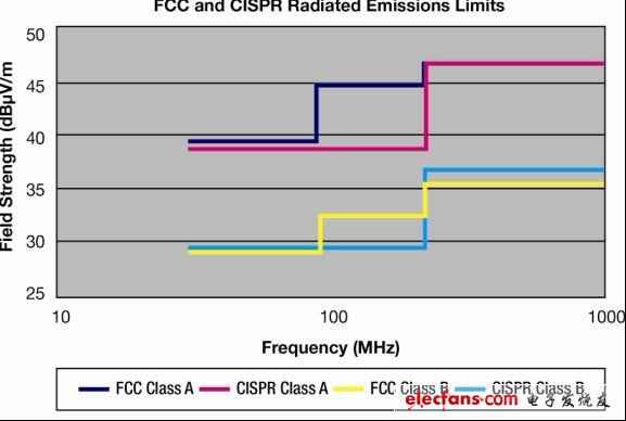 图 2 FCC 和 CISPR 辐射限制—30MHz 到 1GHz,测量距离 10m