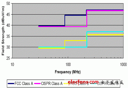 图 2 FCC 和 CISPR 辐射限制—30MHz 到 1GHz,测量距离 10m